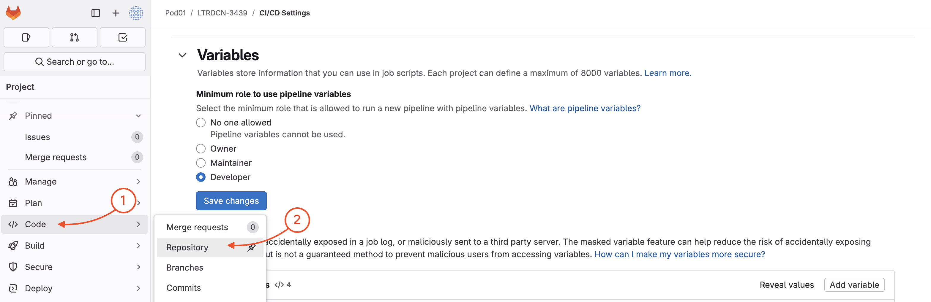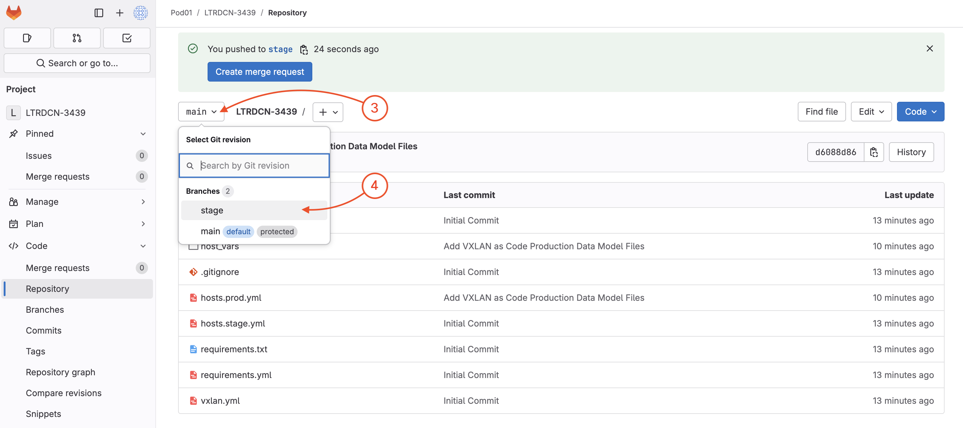 Return to GitLab in your browser. In the branch drop-down, select your stage branch: