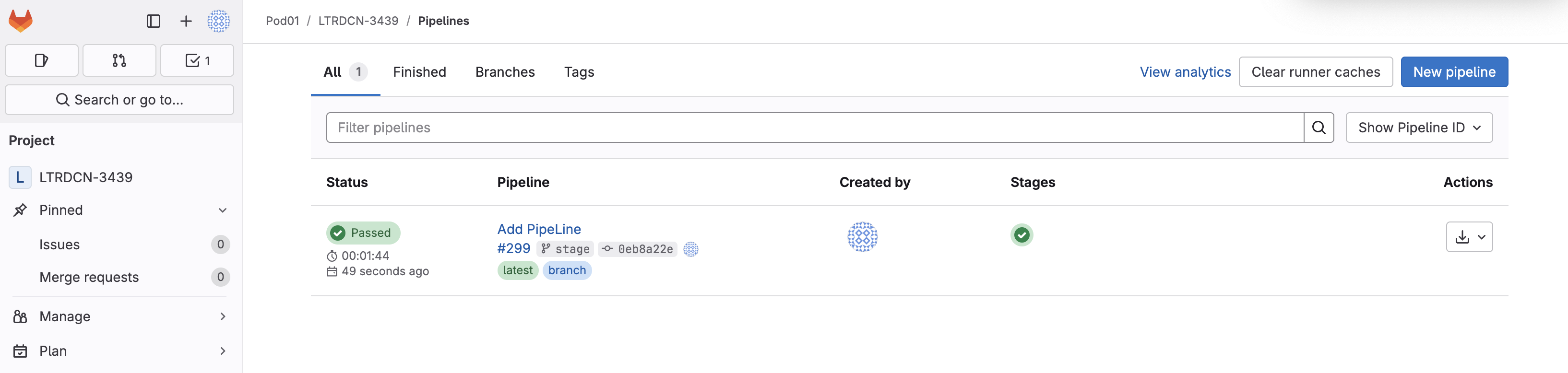 Enumerating objects: 8, done. Counting objects: 100% (8/8), done. Delta compression using up to 8 threads Compressing objects: 100% (6/6), done. Writing objects: 100% (6/6), 1.85 KiB | 1.85 MiB/s, done. Total 6 (delta 2), reused 0 (delta 0), pack-reused 0 remote: remote: To create a merge request for stage, visit: remote: http://10.15.0.159/Pod01_2025_01/LTRDCN-3439/-/merge_requests/new?merge_request%5Bsource_branch%5D=stage remote: To 10.15.0.159:Pod01_2025_01/LTRDCN-3439.git * [new branch] stage -> stage Branch 'stage' set up to track remote branch 'stage' from 'origin'.