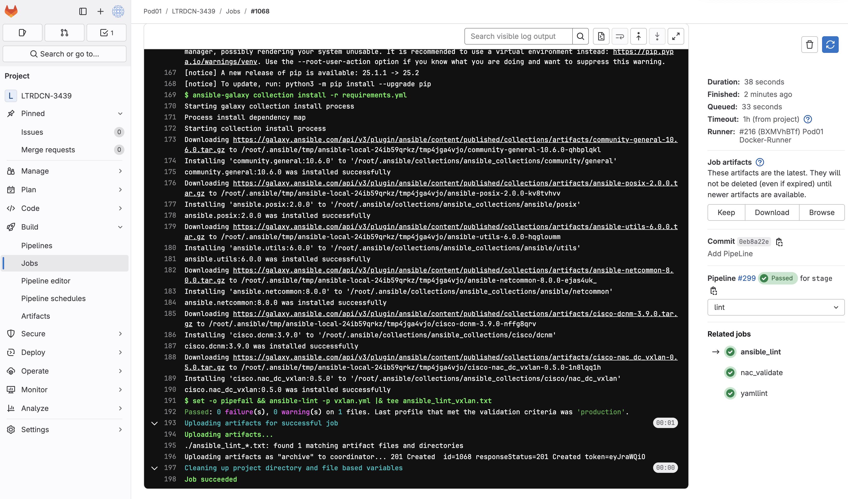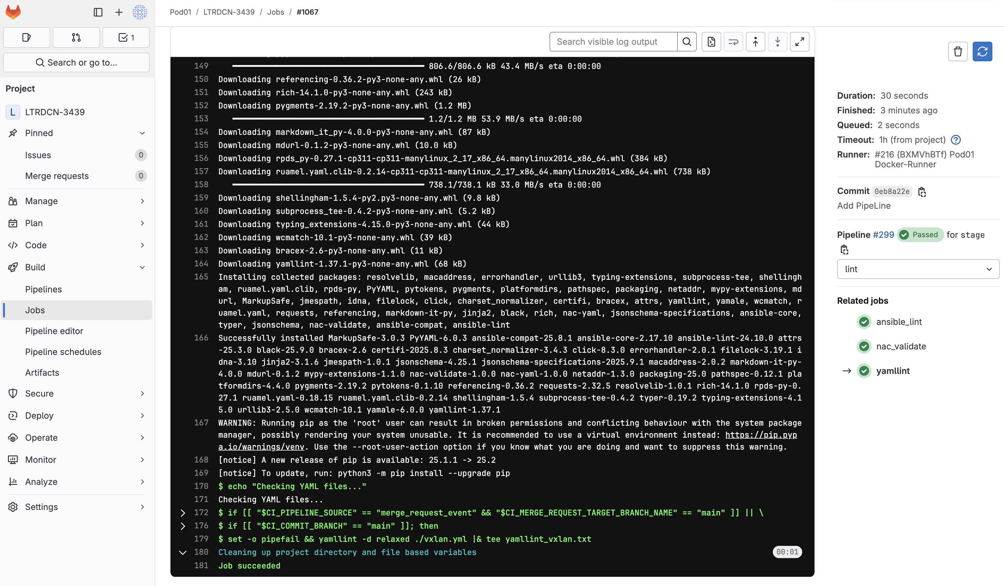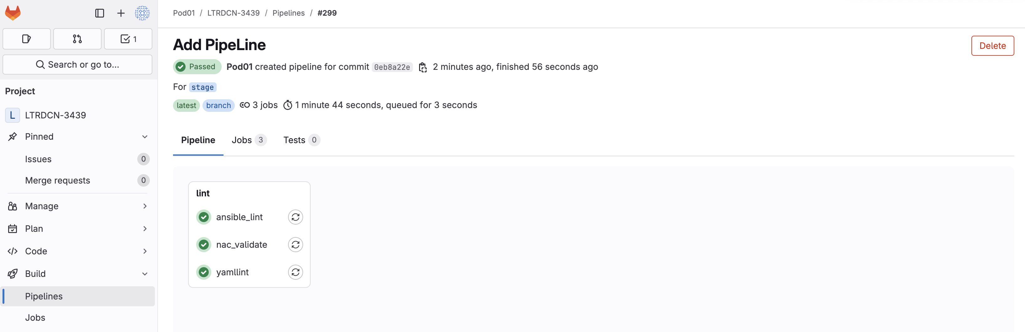As soon as the code was committed to the stage branch, Ansible Lint validation was triggered, open pipelines: