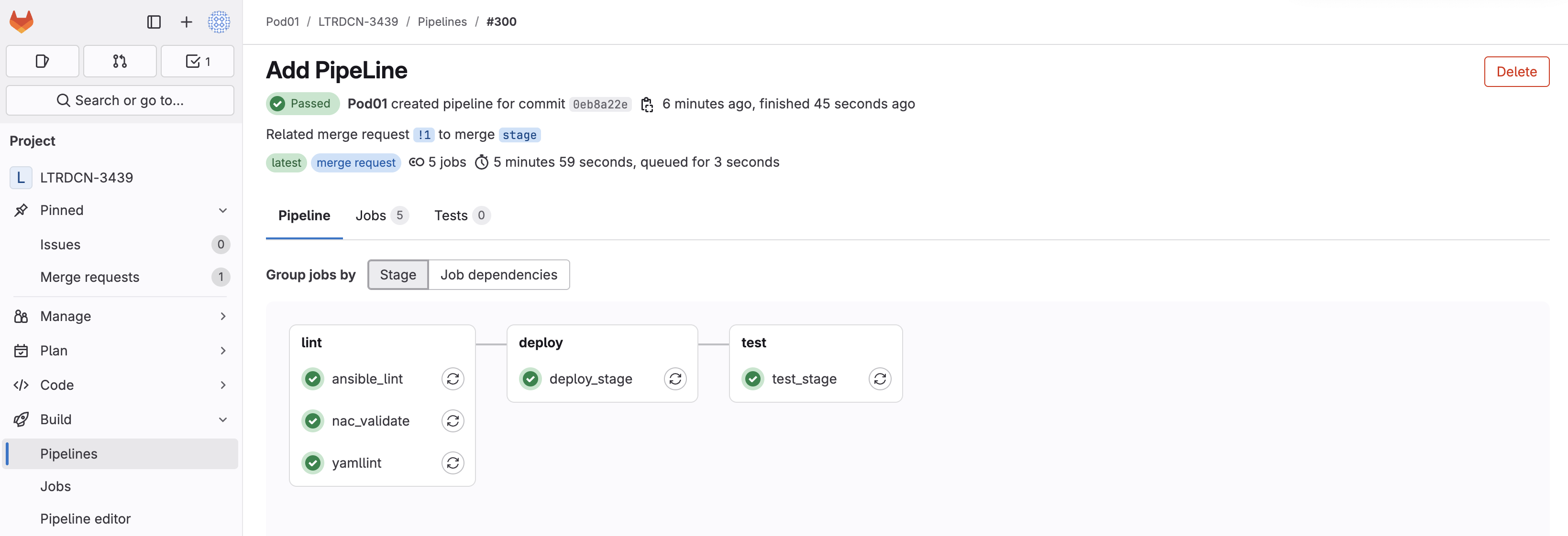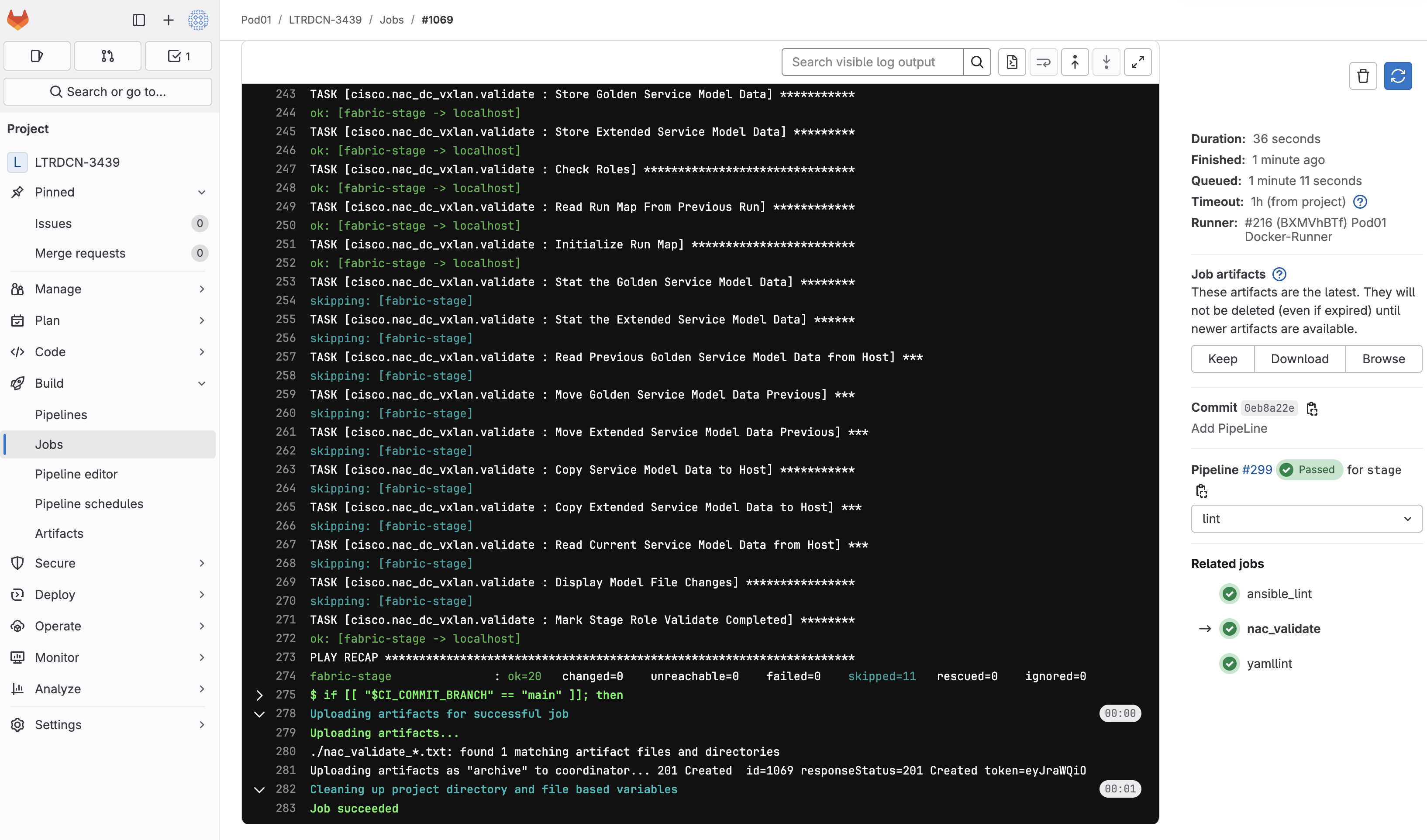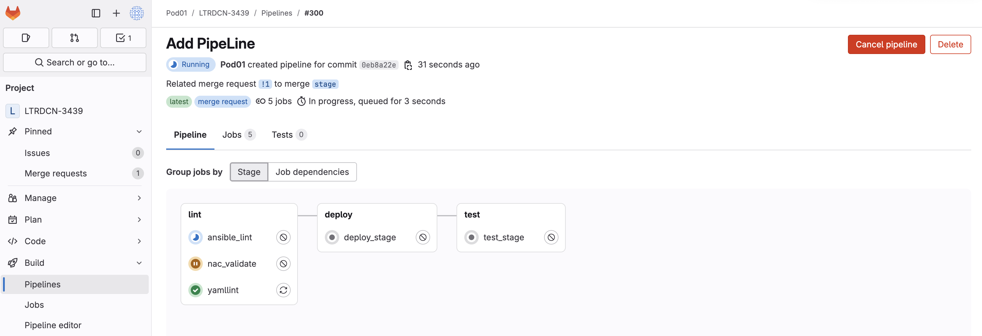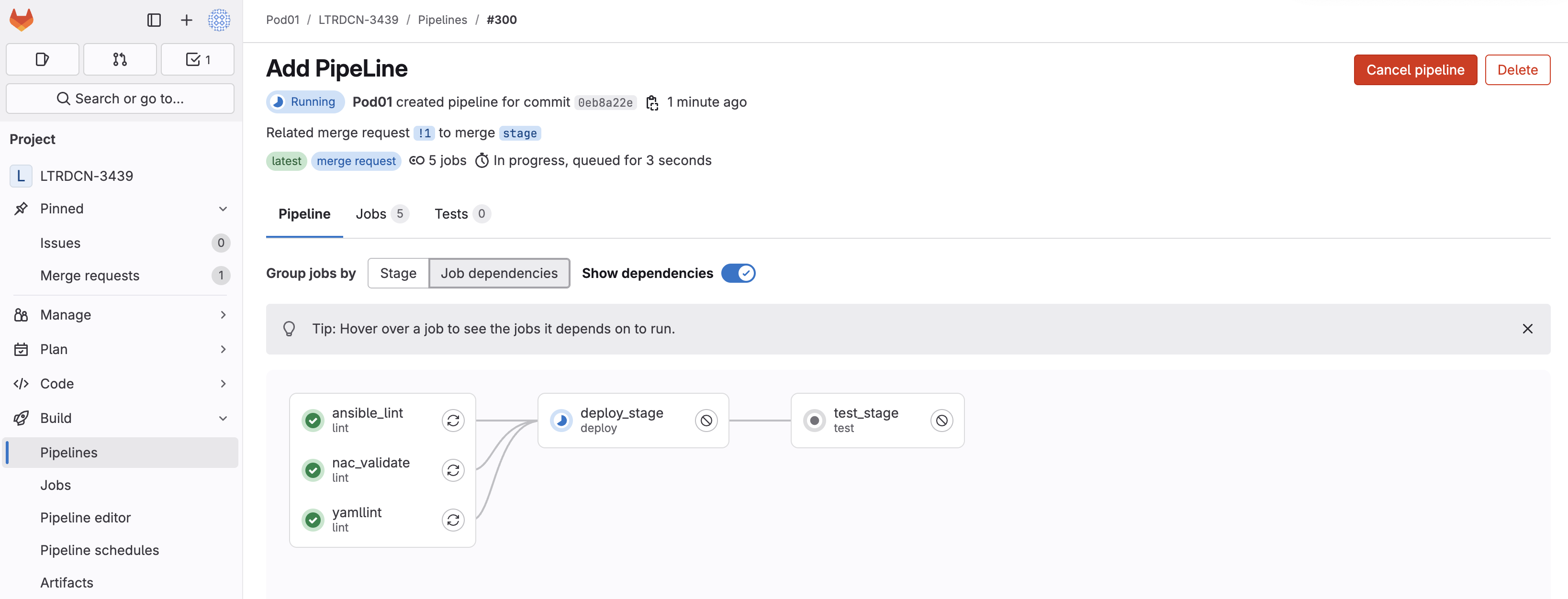 As soon as the code was committed to the stage branch, Ansible Lint validation was triggered, open pipelines: