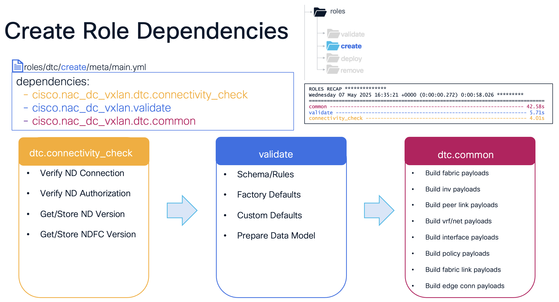 As you can see from the ROLES RECAP, the dependency roles take around 50 seconds to run before the cisco.nac_dc_vxlan.dtc.create