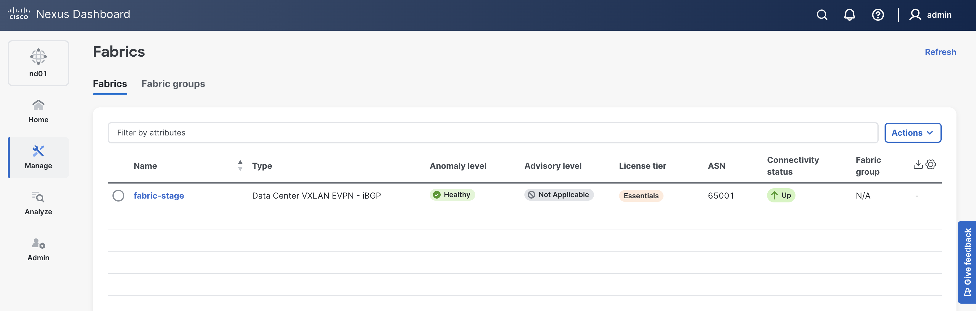 Return to ND in your browser where you should still be sitting at the Fabrics dashboard. After the playbook has run, verify your staging fabric has been created by Ansible.